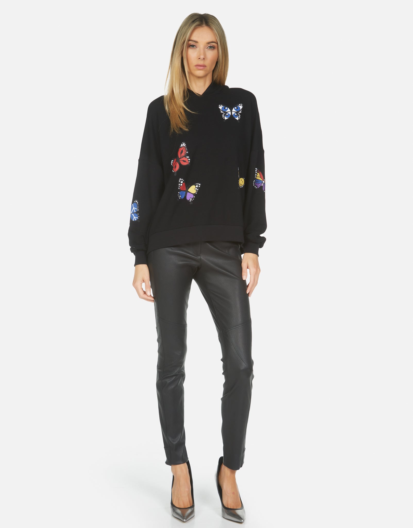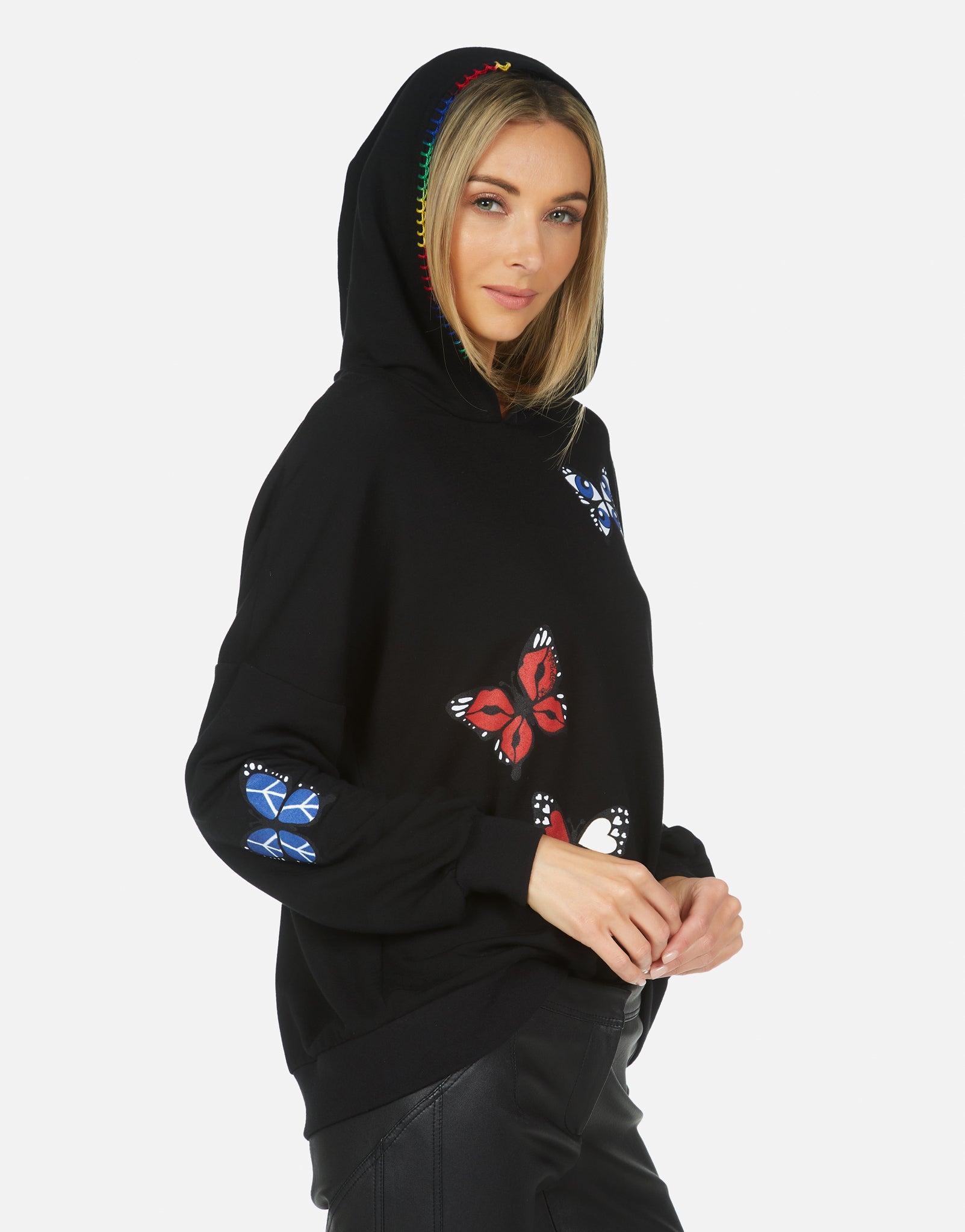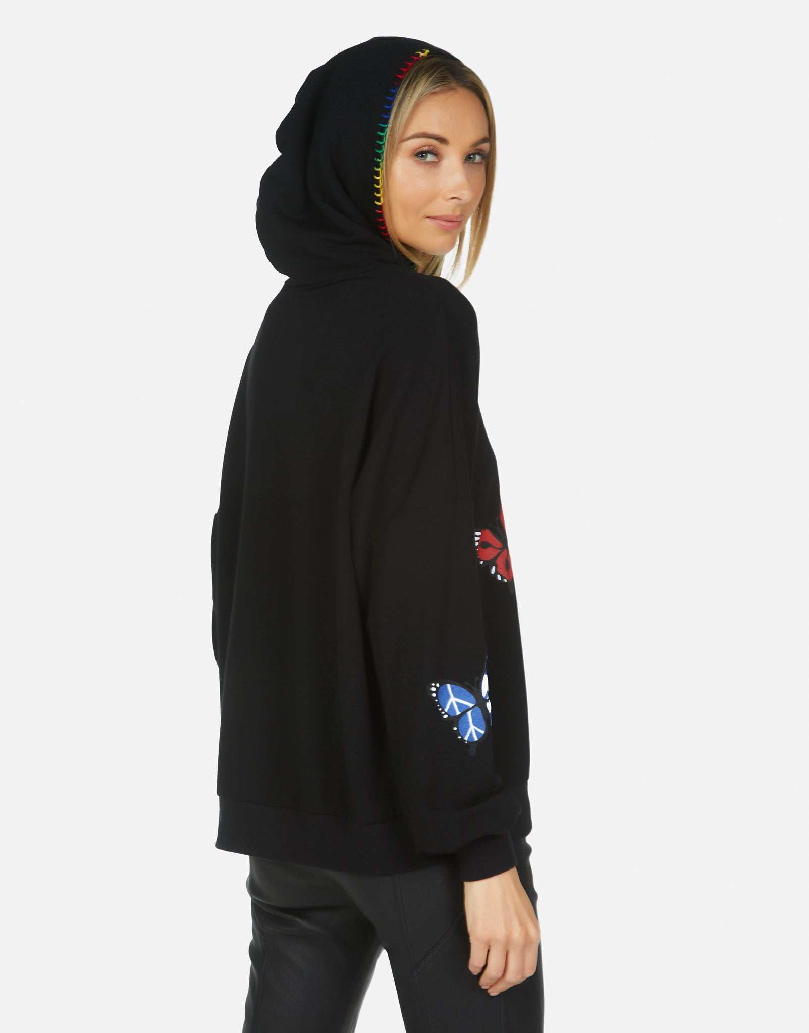 Not what I was expecting. Kind of flimsy, soft cotton. Thought it would be more sweater-like. Also, the butterflies are kitschy, with little smiley faces, etc. In the pic they just look colorful, not cartoonish.